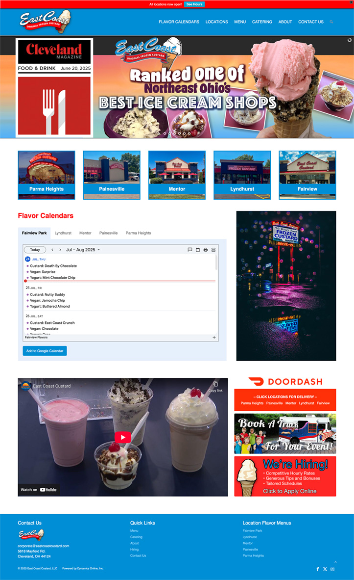 East Coast Custard—a chain of frozen custard shops in the greater Cleveland, Ohio area—has been relying on Dynamics Online for website maintenance and design work since September of 2017. In the summer of 2025, we updated the site with a new WordPress theme and flavor calendar system to enhance mobile functionality and allow for easier client updates.